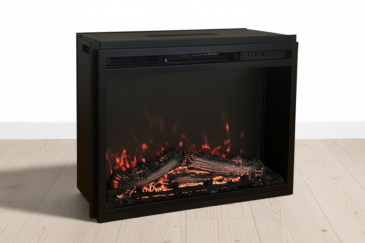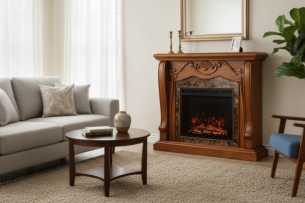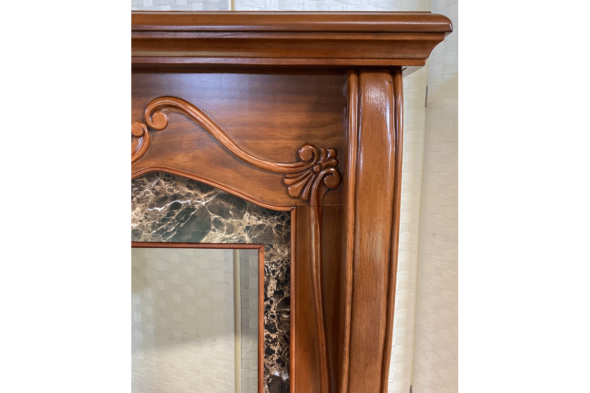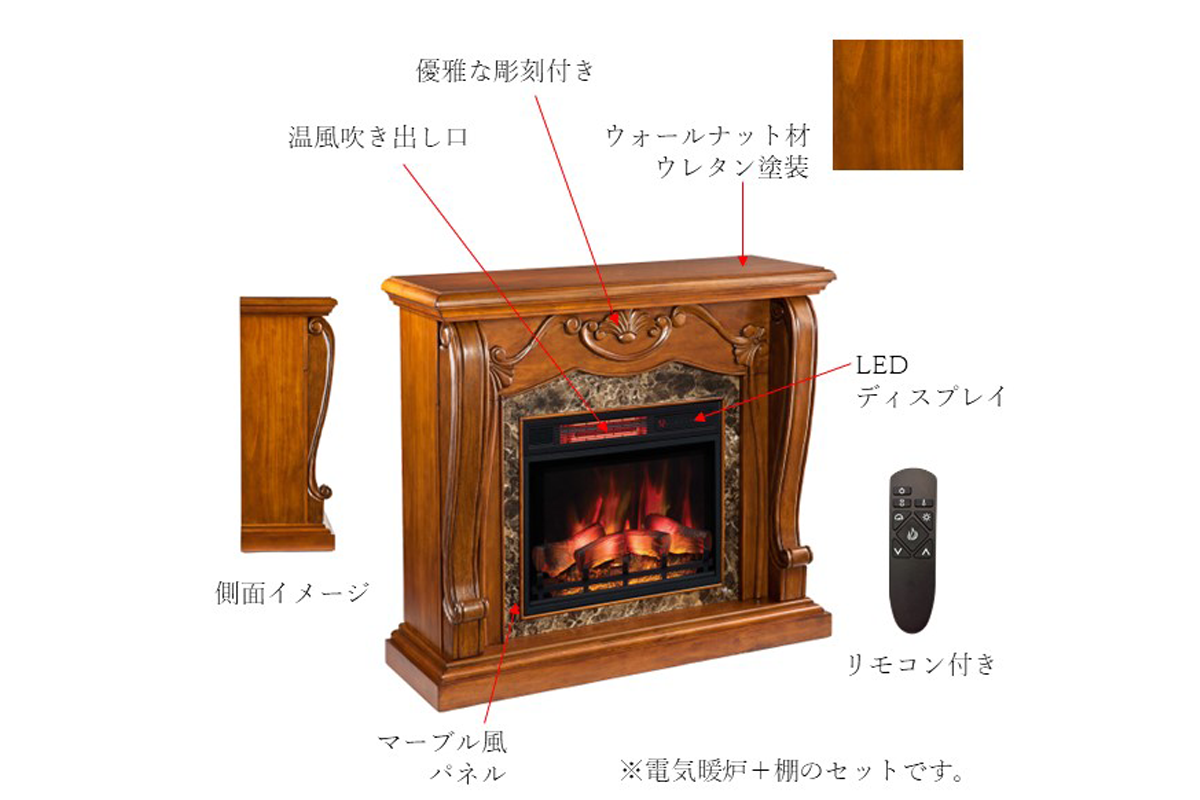 優雅なビクトリア調のデザインのウォールナット仕上げとブラウンマーブルの組合せが豪奢な電気暖炉です。