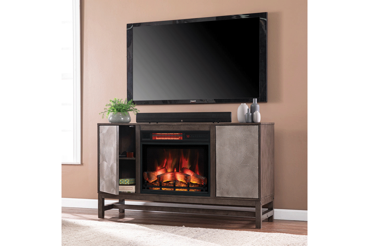 テクスチャード加工のドアが印象的なコンソール電気暖炉です。両サイドは、棚板付きの収納スペースになっています。
