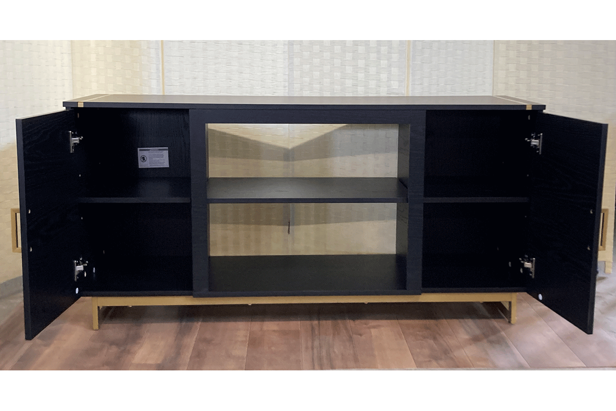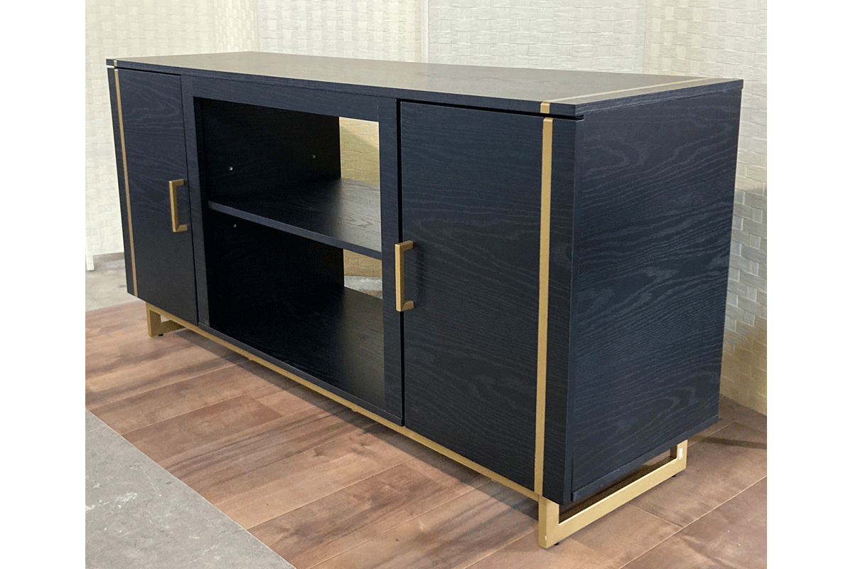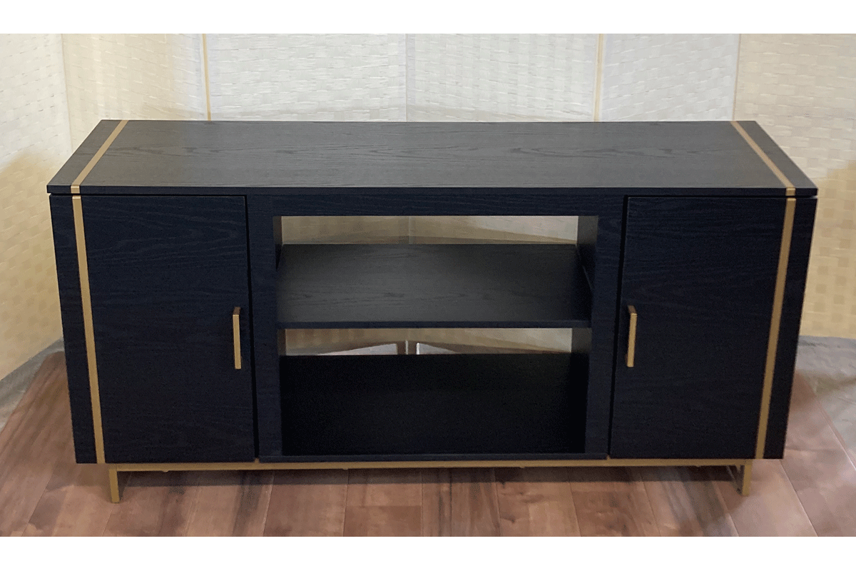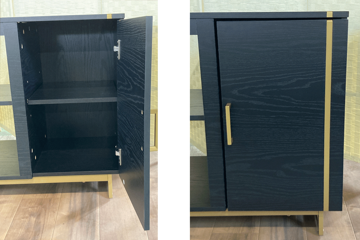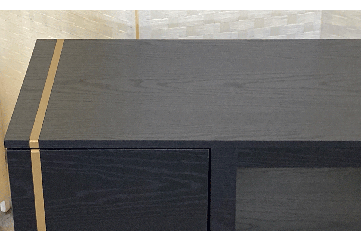 シックなスタイルのコンソール電気暖炉です。ゴールドのアクセントが洗練されたモダンな雰囲気を加えます。ソフトクローズドアになっています。
