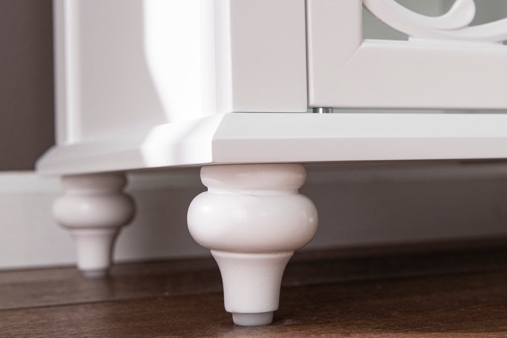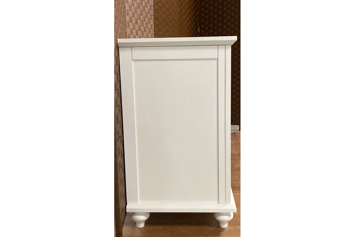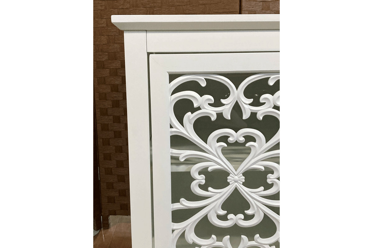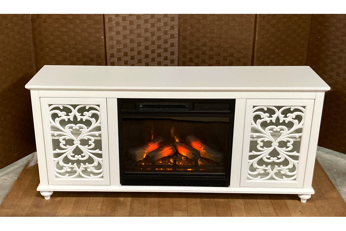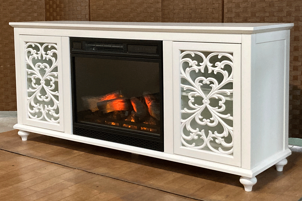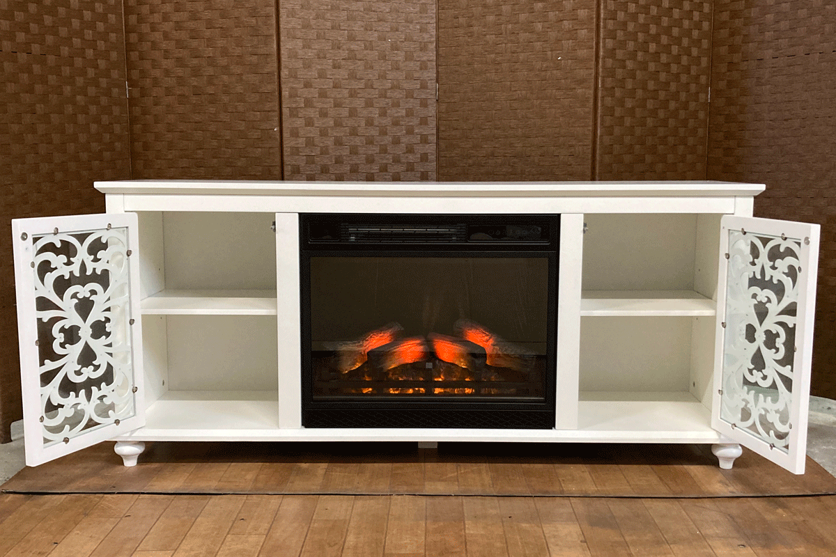 彫刻が施されたキャビネットドアが素敵なコンソール電気暖炉です。両サイドは、棚板付きの収納スペースになっています。