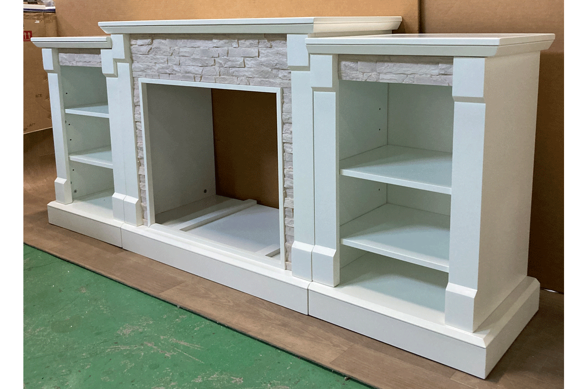 エレガントなホワイトストーンのブックケース付暖炉棚です。