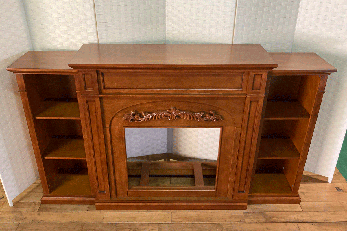 伝統的なデザインに繊細な彫刻が特徴のブックケース付暖炉棚です。